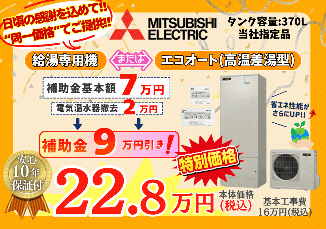 | 商品名 | ⑬MITSUBISHI エコオートタイプ(高温差し湯) 370L |